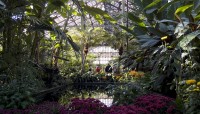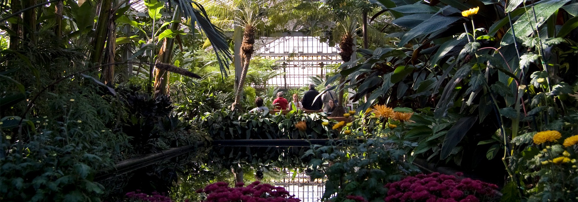 Located in Garfield Park and measuring two acres, this conservatory was designed by landscape architect Jens Jensen in collaboration with the New York-based engineering firm Hitchings & Company. The large structure replaced three smaller greenhouses dating to the 1880s. Considered revolutionary when it opened in 1908, its form emulated a Midwestern haystack, while its interior rooms provided magnificent views. Jensen accomplished this by keeping the centers of rooms open and planting into the ground plane rather than exhibiting plants in potted containers. Walls of stratified stone separated interior spaces and hid mechanical systems. The Fern Room, as the complex’s central focus, includes a “prairie waterfall” and pool bordered by stratified stone. Jensen’s original plant collections were improved upon by August Koch, chief florist at the conservatory from 1912 through the 1930s. Koch turned the original Conifer House into an Aroid House but remained faithful to Jensen’s design idiom.