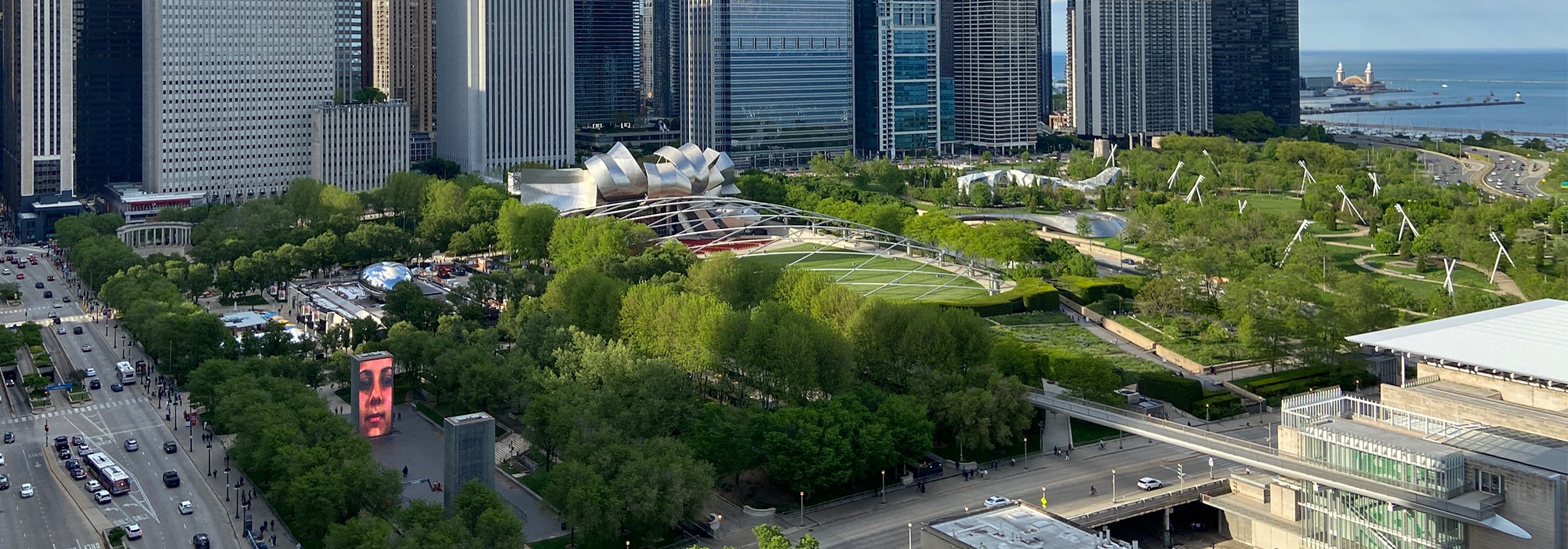 Opened in 2004, the park includes several amenities laid out as an extension of Grant Park’s outdoor rooms defined by mature sycamore, honey locust, and maple trees. At the heart of the park, the Jay Pritzker Pavilion includes a 4,000-seat bandshell designed by Frank O. Gehry & Associates (now Gehry Partners). A serpentine pedestrian bridge, also designed by Gehry, connects Millennium Park to Maggie Daley Park to the east. To the south of the Pavilion, the Great Lawn provides flexible space for 7,000 people. Beyond that, the three-acre Lurie Garden, designed by landscape architects Gustafson Guthrie Nichol and plantsman Piet Oudolf, offers a diverse and evolving collection of thematic plantings inspired by Midwestern ecosystems. West of the Lurie Garden, the 620-foot-long Nichols Bridgeway, designed by Renzo Piano Building Workshop, spans Monroe Street to connect the park to the Art Institute of Chicago. Nearby, Crown Fountain, by artist Jaume Plensa, is an interactive public art exhibit that features a black granite reflecting pool and two 50-foot towers that display videos of 1,000 faces spewing water through pursed lips. To the west of the pavilion, the polished surface of Anish Kapoor’s Cloud Gate (“the Bean”) reflects the surrounding city. The eight-acre, Beaux-Arts Chase Promenade provides an outdoor exhibit space and connects two outdoor galleries. In the northwest corner of Millennium Park, Wrigley Square comprises a lawn, a fountain, and a replica of the peristyle that stood in Grant Park between 1917 and 1953.