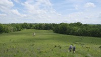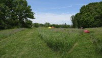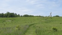 From the entrance, meadows extend on either side a copse that screens an elongated pond from view. Moving through the undulating topography, sculpture and follies are gradually revealed to the visitor. Mown paths traverse the meadows whereas earthen ones wend through woodlands of maple, oak, and cherry trees. The meadows vary in size and topographic variation, with hillcrests often crowned by monumental works.