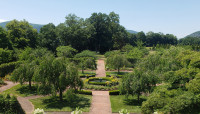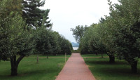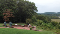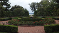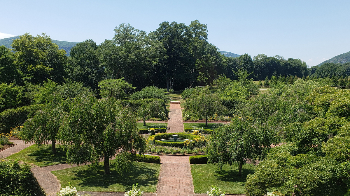 Oriented northeast to southwest, framing views of the Hudson River and Highlands, the Maple Allée is the defining feature of Webel’s Beaux-Arts plan. Running in a straight line covering the length of the main lawn area, it originates near the mansion and forecourt. At its northernmost tip, it curves downward to the west, along a parallel brick path that bisects a gridded apple orchard proceeding past a carriage house, orangery and herb garden. Its axial terminus is a fountain centered on a quadrated rose garden, which also resides on a cross axis with the mansion and a hedge-framed river view. Past the mansion on the bluff’s edge, a semicircular brick belvedere overlooks the river. A large pond to the east is bounded by a brick wall, connecting to the Frances Stevens Reese Woodland Trail.