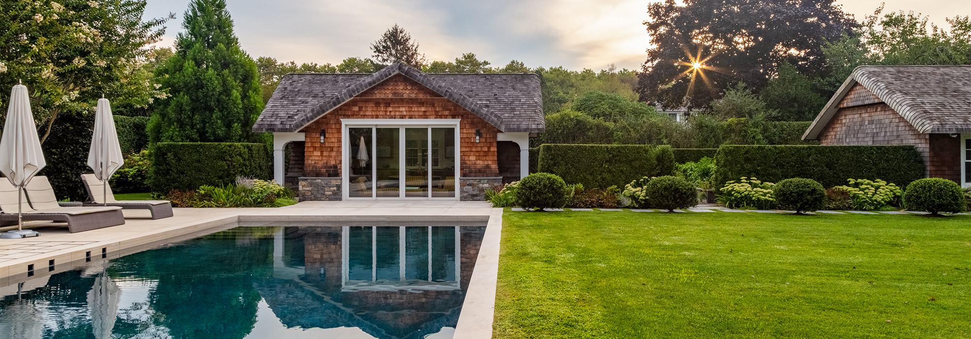 View of the pool through a hedge "door" at Beech House, Southampton, NY - Photo by Kyle J. Caldwell, 2020