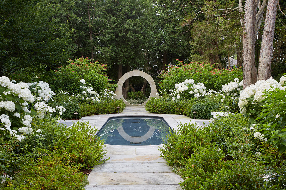 Openings in the hedges throughout the garden reveal enticing hints of other “rooms,” including a secluded oasis perfect for quiet contemplation. A pair of custom “Moon Gates,” carved from reclaimed Ohio sandstone blocks by Lido Stone Works, rest at each end of a small reflecting pool. The result is a serenely luxurious respite, ideal for reflection and relaxation.