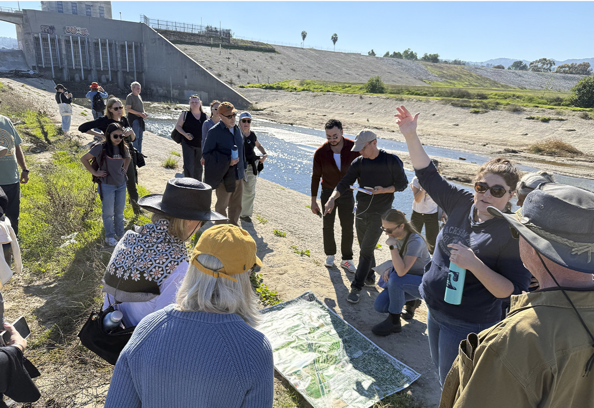 The mobile workshops on Saturday, December 6 included four based on projects presented at the conference. For attendees, it was an opportunity to get a deeper understanding of the Sepulveda Basin, the UCLA campus, Milton Street Park, and SoFi Stadium, and to hear from various members of the design team. At Metabolic Studio, Bon and her team discussed how urban soils, particularly in frontline communities, have been deeply impacted by the city’s industrial legacy and the 2025 wildfires. The USC Inclusive Infrastructure Design Lab Field Session included a walk along a section of the LA River and flooding simulations on a precisely engineered 60-foot-long, 1:120 hydraulic model of the river.