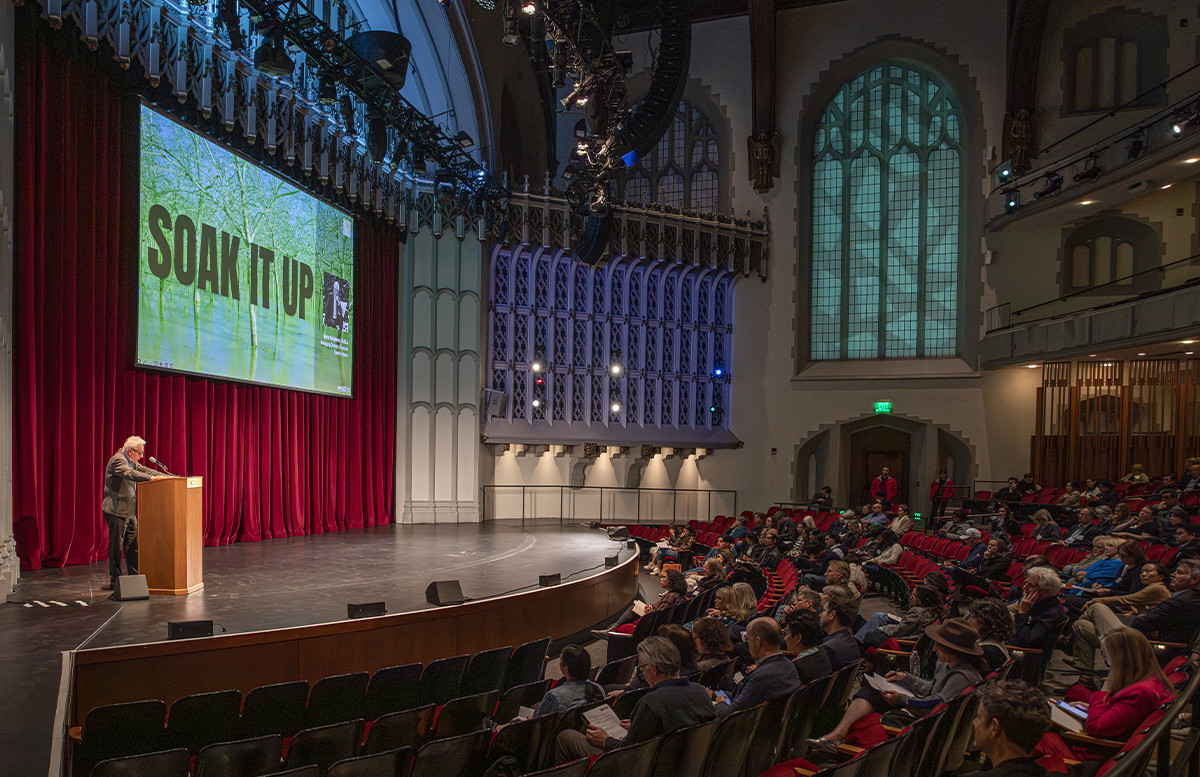 Six hundred people registered for the three-day Oberlander Prize Forum Soak it Up: Los Angeles, CA, which had as its centerpiece a daylong conference at the elegant Bovard Auditorium at the University of Southern California (USC) about landscape architecture’s leadership in managing the Los Angeles River, urban flooding, and drought in Southern California. The Cultural Landscape Foundation (TCLF) event received generous support from lead sponsors SWA and PlayCore, along with a dozen other sponsors including OLIN, the Shafran + Haimes Foundation, SPJ Lighting, and West 8. It was curated by Prof. Alison Hirsch, PhD at the USC School of Architecture and Charles Birnbaum, TCLF’s President and CEO. Bookending the conference was an evening reception at SWA’s new LA studio and a day of mobile workshops at notable built projects in the LA area. Soak it Up was slated to be the final program associated with, and was to feature, the 2023 Oberlander Prize winner Kongjian Yu, the Beijing-based landscape architect and global champion of the “sponge cities” concept for mitigating urban flooding. However, following his tragic death on September 23, 2025, in a small plane crash in Brazil, Soak it Up evolved into a memorial to him and his revolutionary work. Videos of all the conference presentations will be richly produced and unveiled in 2026.