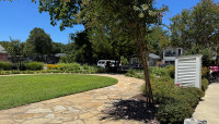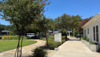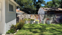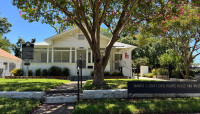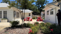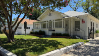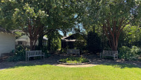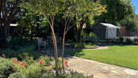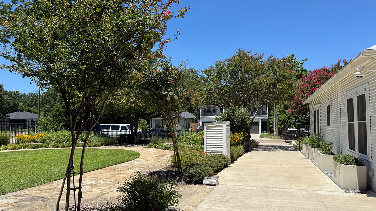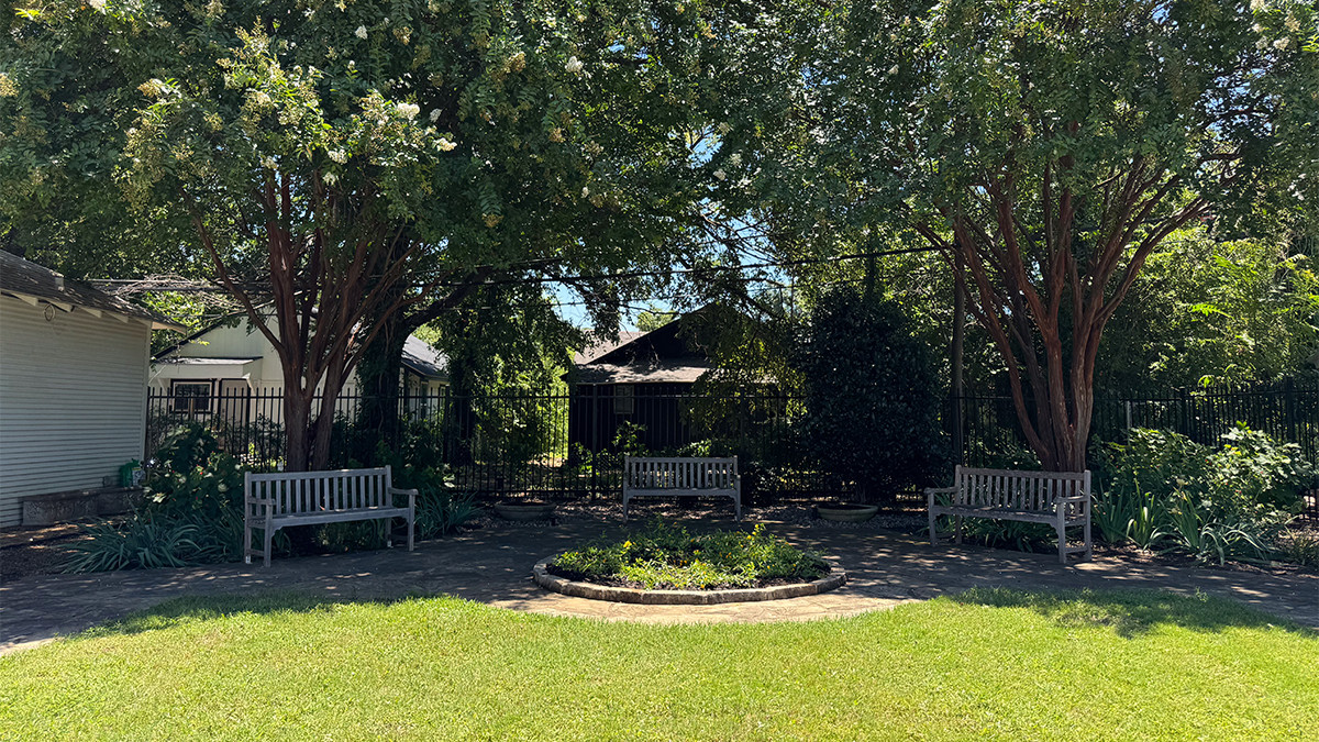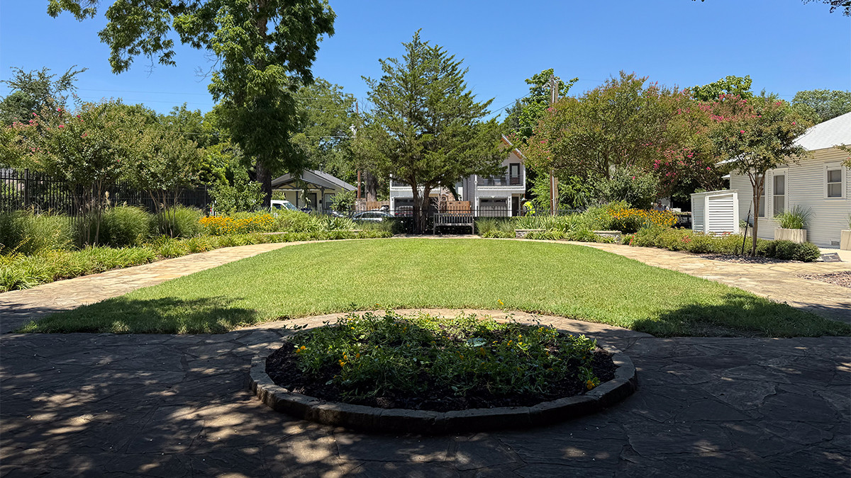 Situated north towards Warren Avenue, the home, set back from the street and enclosed by a metal fence, is fronted by a small lawn shaded by a crape myrtle tree. The level lawn is partially enclosed by a low, whitewashed stone retaining wall, responding to the subtly sloping terrain. A linear walkway leads from the sidewalk to an enclosed front porch, bordered by boxwood hedges. Lined with square planters, a parallel drive to the west leads to a furnished patio and small, rectangular lawn—which features round planters and an original brick barbecue pit (1950)—between the bungalow and a wood-frame garage (“Little House”). The patio adjoins the memorial garden, where an elliptical, flagstone pathway—surrounded by irregularly shaped beds of deciduous trees, including crape myrtle and pecan, and perennials, such as yucca and Black-eyed Susan—enclose a broad lawn, anchored at the south end by a circular bed of flowering shrubs.