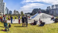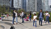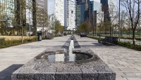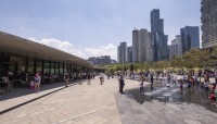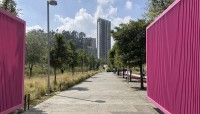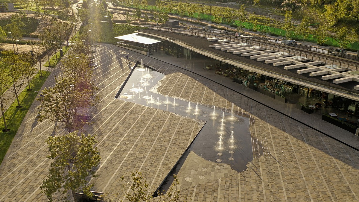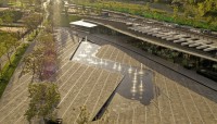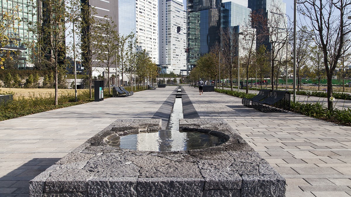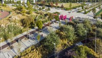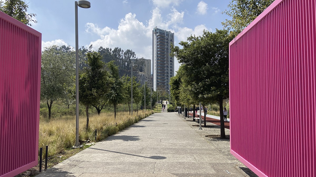 Principal pedestrian access to La Mexicana Park (Parque La Mexicana) is provided by two broad allées of trees at the northeastern end that leads to bright pink entry gates inspired by architect Luis Barragán. This gateway connects with a paseo/promenade that runs the length of the park, as well as a separate recreational loop for walking and biking. Another access point is from an underground parking garage, from which an elevator transports visitors to a restaurant terrace on the park’s eastern side. A central plaza is nestled between the terrace and paseo, featuring an angular splashpad.