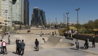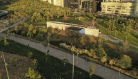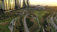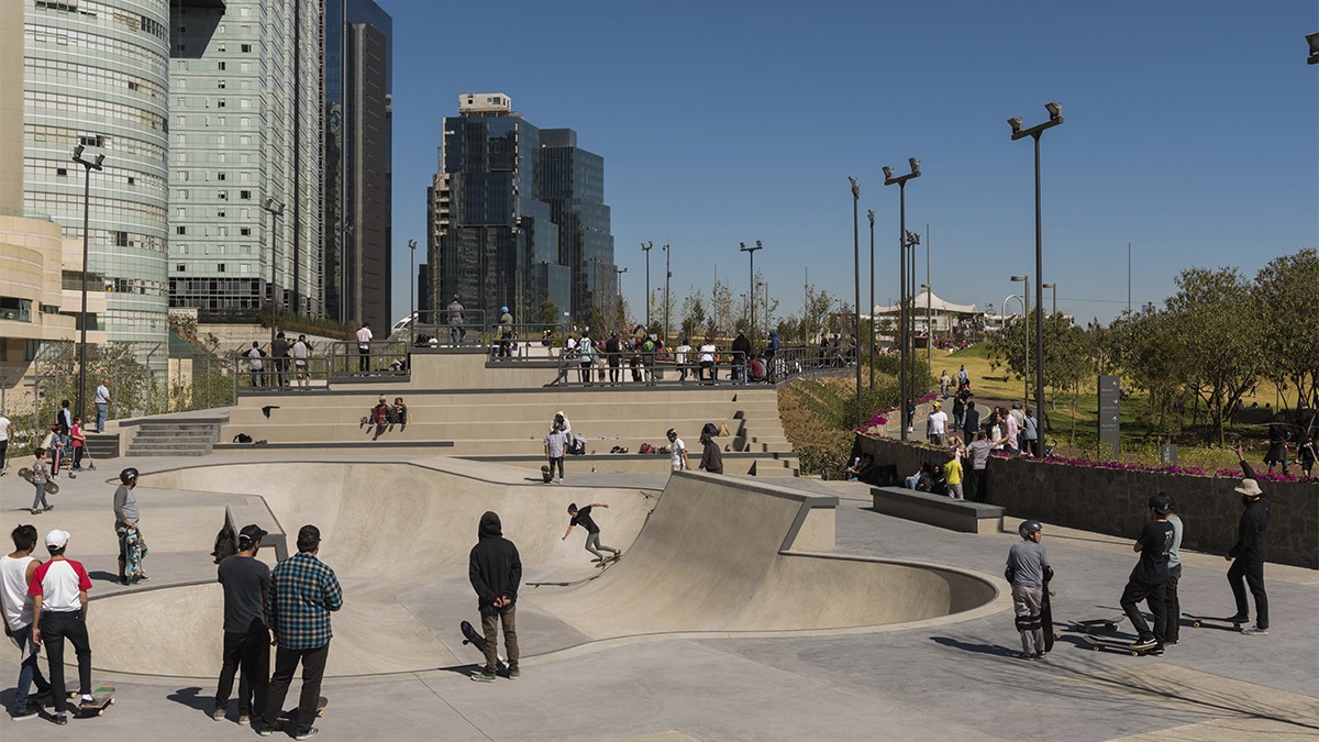 Lush, native grasses, flowering shrubs, and deciduous and evergreen shade trees characterize distinctive areas, such as the terraced “Hidden Gardens” that take the form of oval lawn depressions, and a sloping amphitheater that wraps around the southern-most lake with an angular, red acoustic bandshell (by architect Omar Saad). On the park’s elevated western edge, amenities are screened from the paseo, including a dog park and skate park, while at the park’s southwestern edge, a roller-skating park, athletic fields, and nature preserve are sited atop a partially underground supermarket. Avenue Luis Barragán separates the latter section but accommodates access via a pedestrian bridge.