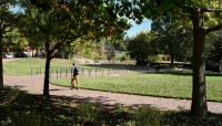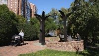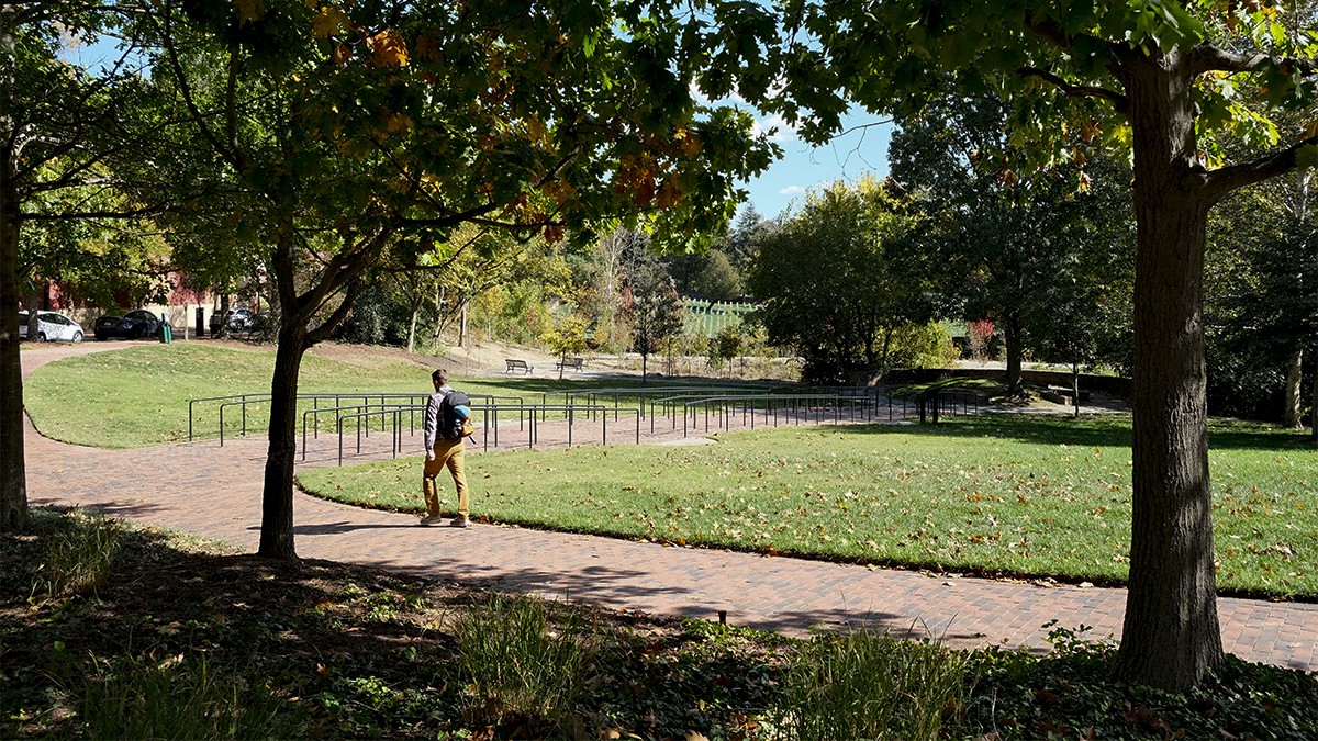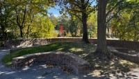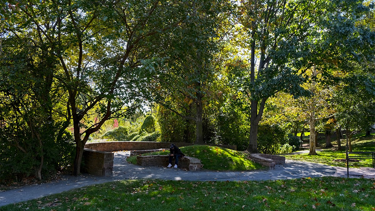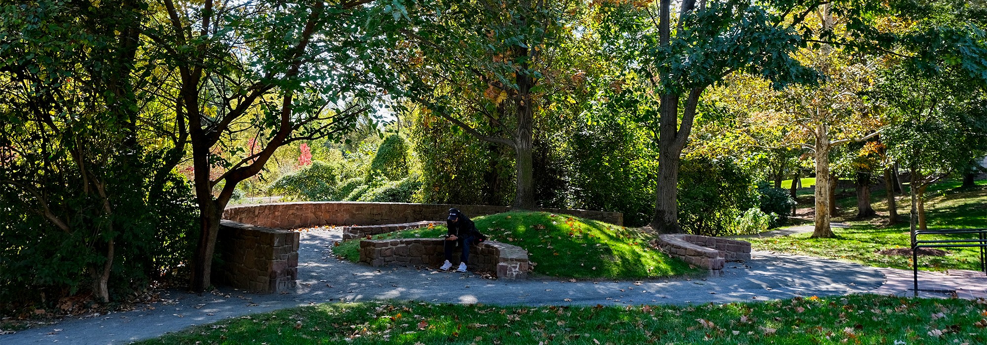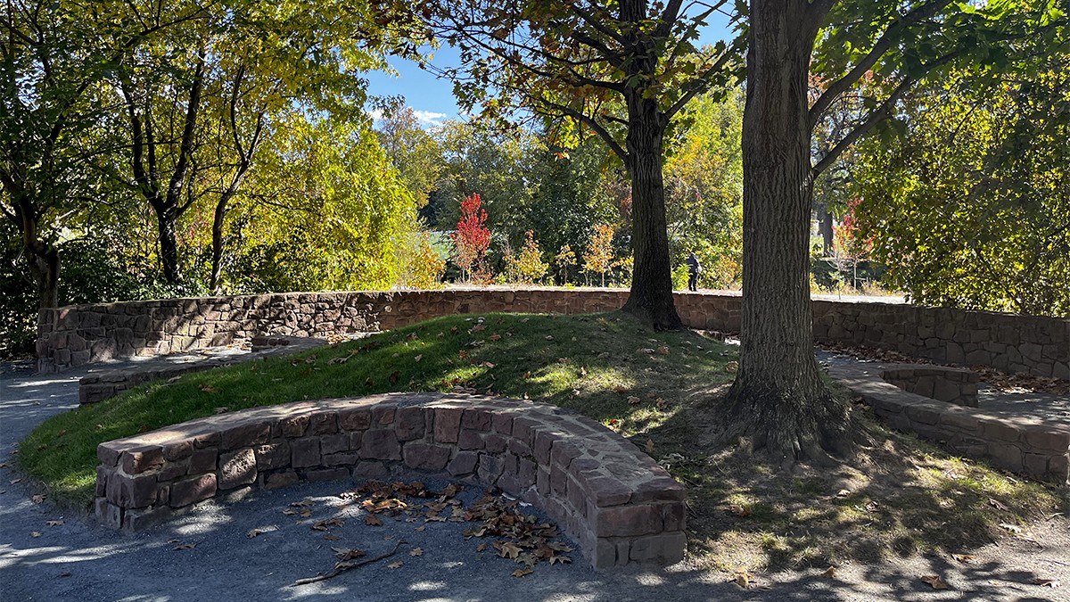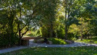 Completed in 1995 the park slopes downward from Holland Lane toward the creek and is characterized by expanses of lawn and lawn terraces planted with trees, including willow and birch. The upper terrace is navigated by a curvilinear brick path that features a circular overlook offering views of burial markers below. Edged by an arched, stone wall, the overlook is embellished with a multi-part bronze sculpture, Truths That Rise from the Roots Remembered (1995), by artist Jerome Meadows. North of the overlook, at the intersection of Holland Lane and Jamison Avenue, is a wooden pavilion that leads to an axial brick path flanked by sloping lawns. This path is anchored by a modest turf mound planted with oaks framed by arced retaining walls intended for seating. A secondary path follows the creek’s edge, characterized by a wetland that was rehabilitated in 2024 and 2025.
