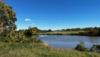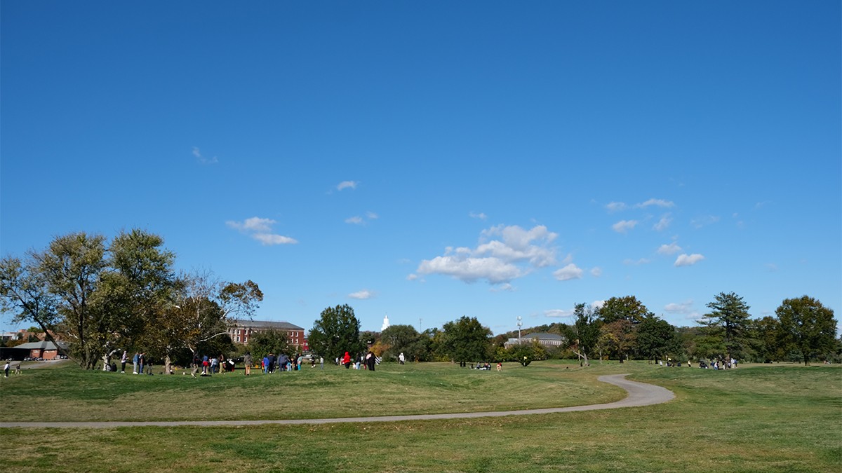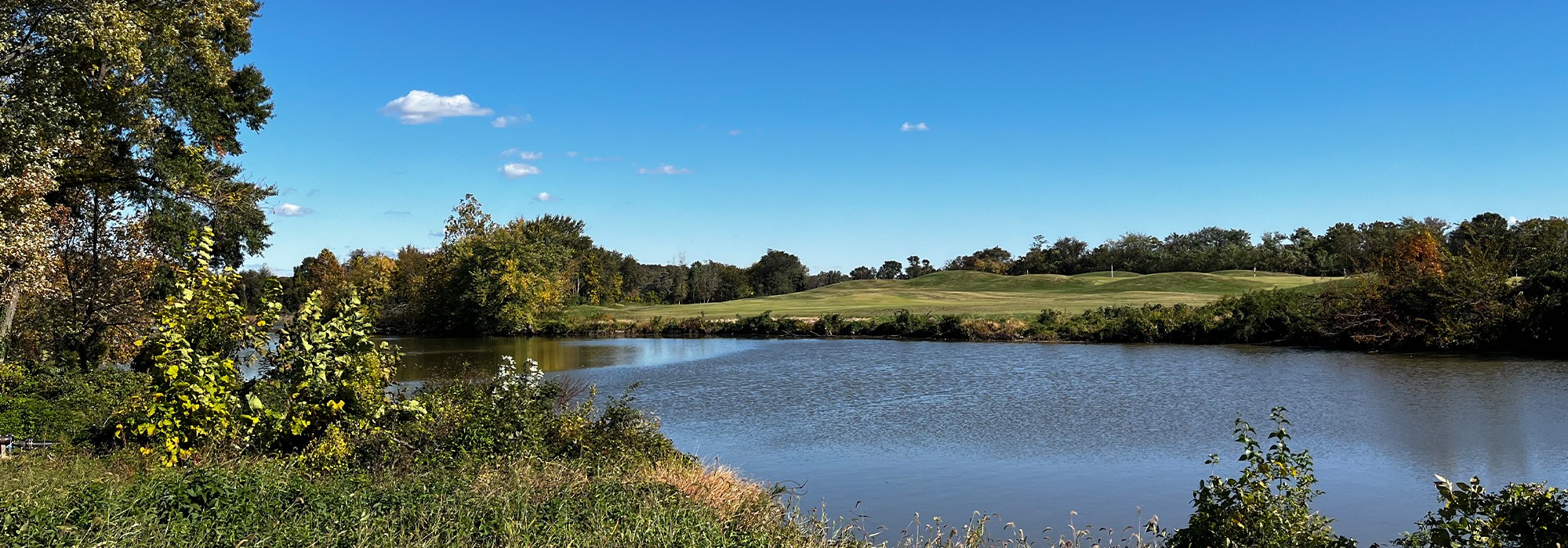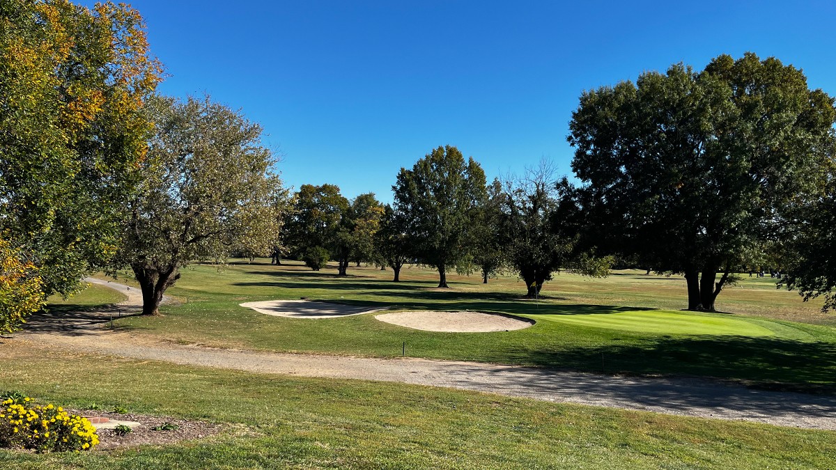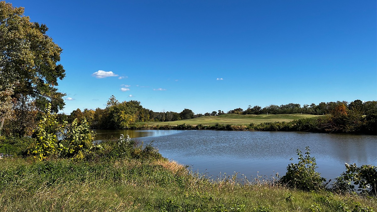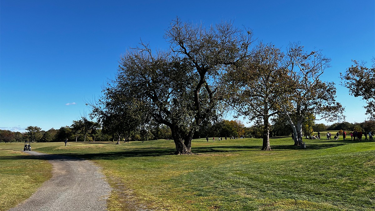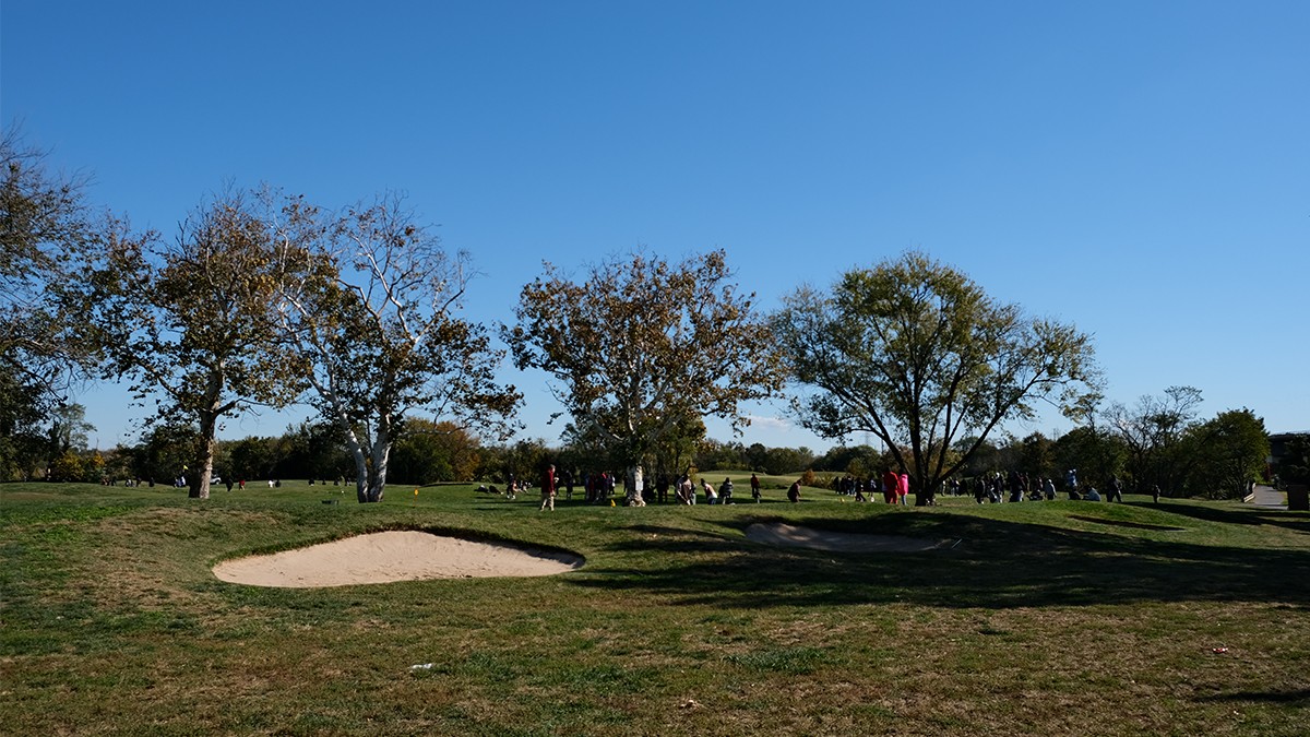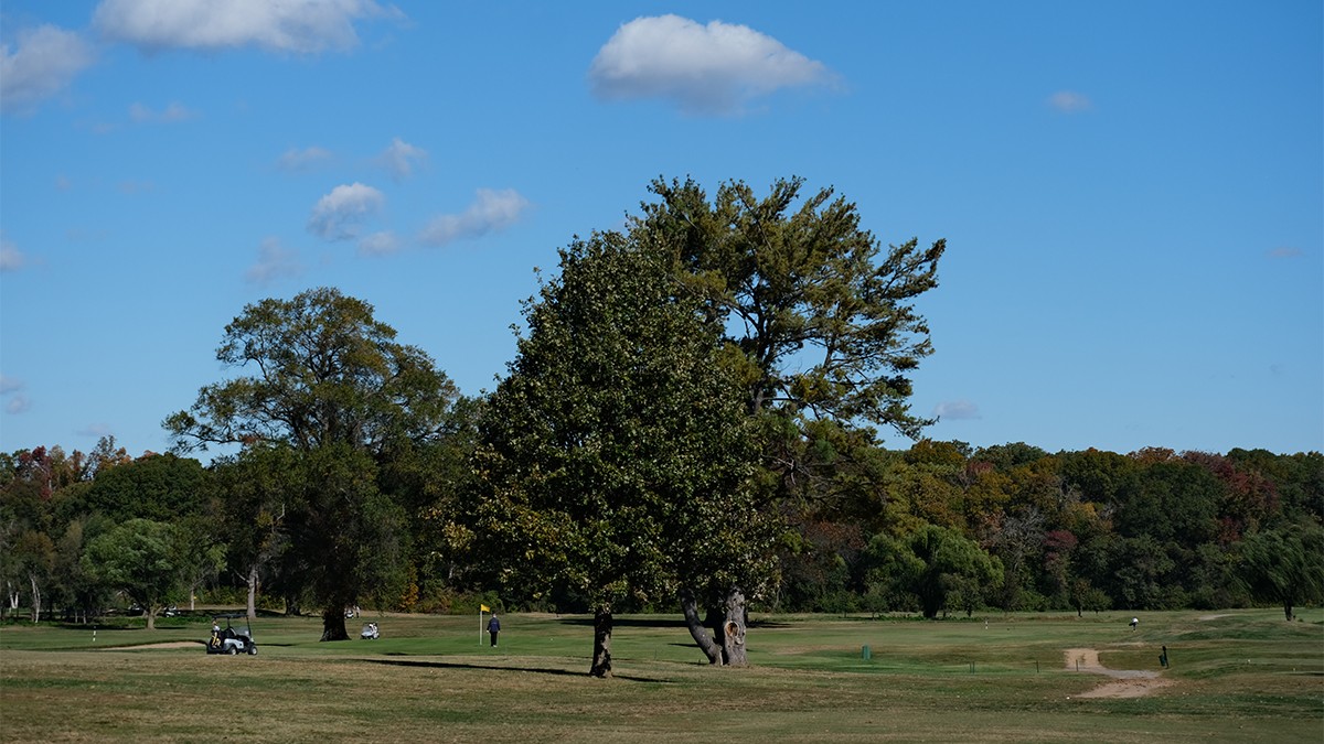 The otherwise relatively level terrain is shaped by man-made hills and asymmetrical sand traps. Deciduous and evergreen shade trees (including pine, willow, and willow oak) dot the course and a dense woodland marks its northern perimeter. Breaks in the tree line along the shores of the marshland and along the eastern edge of Kingman Island afford borrowed views of the Anacostia basin.