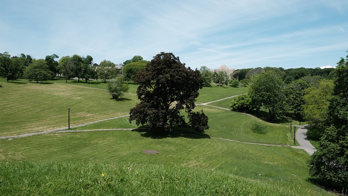 Bisected by a curvilinear, north-south drive, the park comprises distinct western and eastern sections that were developed in the nineteenth century as an estate and as an Irish immigrant community, respectively. In 1890 the city acquired the land and by the early twentieth century laid out drives on the former estate grounds. In 1913 the city engaged landscape architect Charles Downing Lay to prepare a master plan. Working in close collaboration with architect Arnold W. Brunner, Lay’s design retained much of the existing topography, extended the existing curvilinear drives eastward, and introduced recreational amenities throughout.
