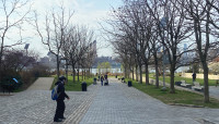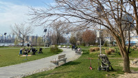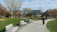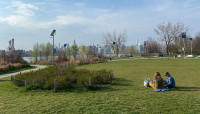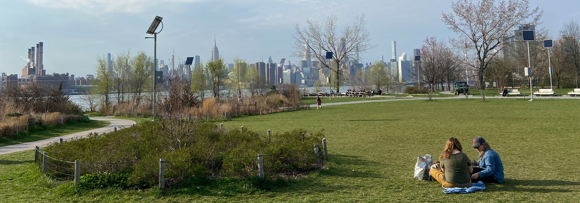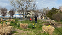 The main entrance on Kent Avenue offers an arcuated, iron gateway decorated with supersized wrought-iron-and-stained-glass flowers and leaves, evoking floral crowns worn frequently by Johnson. Just beyond, an allée of Kentucky coffeetrees leads visitors into the park, which contains several irregularly shaped lawns and ornamental garden spaces. Paths with brick and cobblestones wind across a landscape punctuated by deciduous shade tree groupings, remnants of the former industrial site (including decorative elements and benches made from repurposed wood), and interpretive signage about Johnson. Pre-existing elements include a dog run, playground, and three long, concrete slabs that have been repurposed for seating. At the park’s western edge, a wave-patterned mosaic leads to the shore, where borrowed views unfold of the Williamsburg Bridge and Midtown Manhattan.