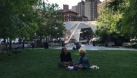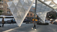 Sited at the northern tip and serving as a gateway to the park, the memorial commemorates the more than 100,000 New Yorkers who died of AIDS and the caregivers and activists who acted on their behalf. The soaring, eighteen-foot-tall canopy of interlocking steel and aluminum triangles shade a low, circular granite fountain. Following its contours is an installation created by conceptual artist Jenny Holzer comprising a spiral of curved-granite pavers engraved with passages from Walt Whitman’s "Song of Myself" (1855). Also accessed via an entrance at the southernmost point, the park was constructed with traditional NYC park details—black metal fencing, hexagonal pavers, standard B-pole light fixtures—and its winding walkways are intermittently lined by arcing wooden benches. At the north end is a small plaza animated with in-ground water jets, and, to the south, is an irregularly shaped lawn, partially framed by curving, granite steps. Beds of flowering shrubs and groundcovers with deciduous shade and flowering trees, including honey locust, linden, magnolia, and dogwood, line lawn areas and the park’s perimeter.