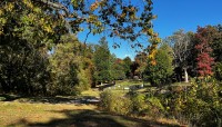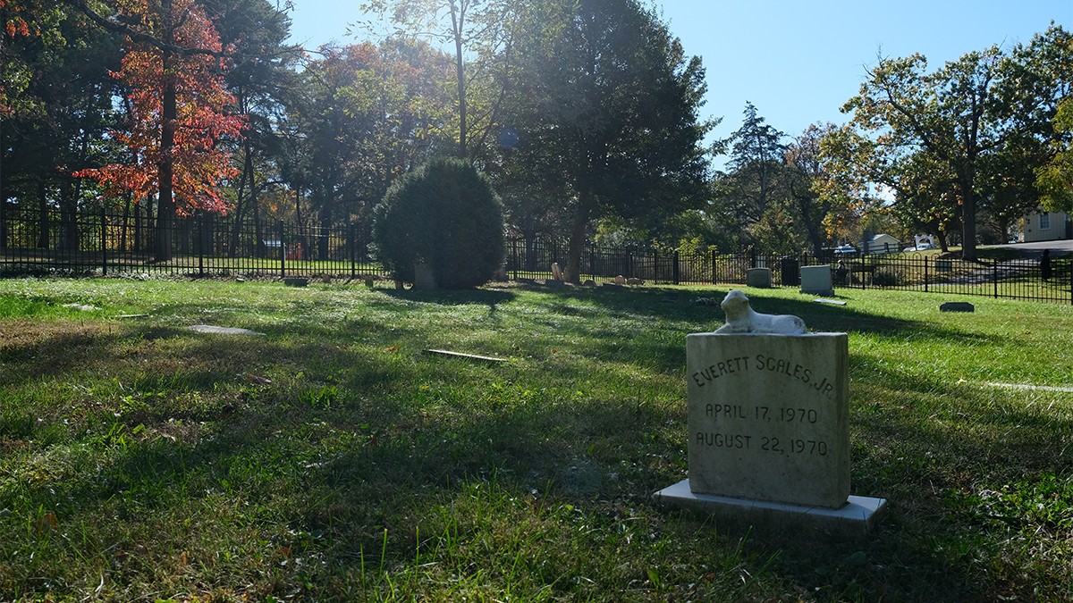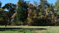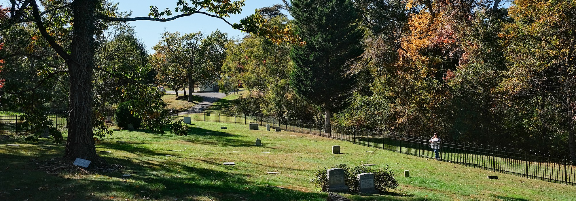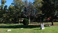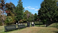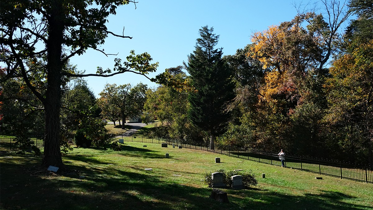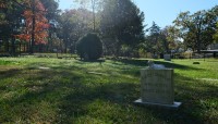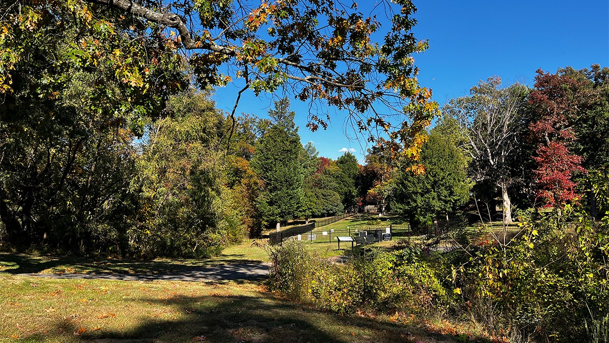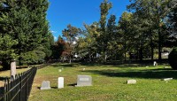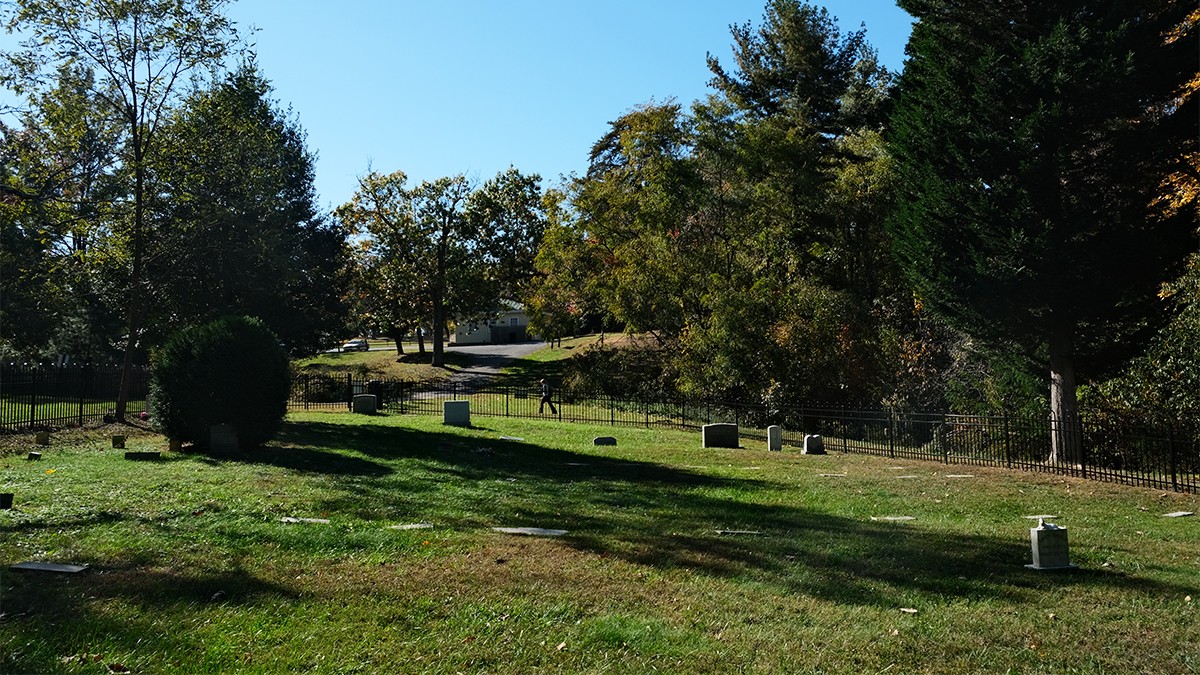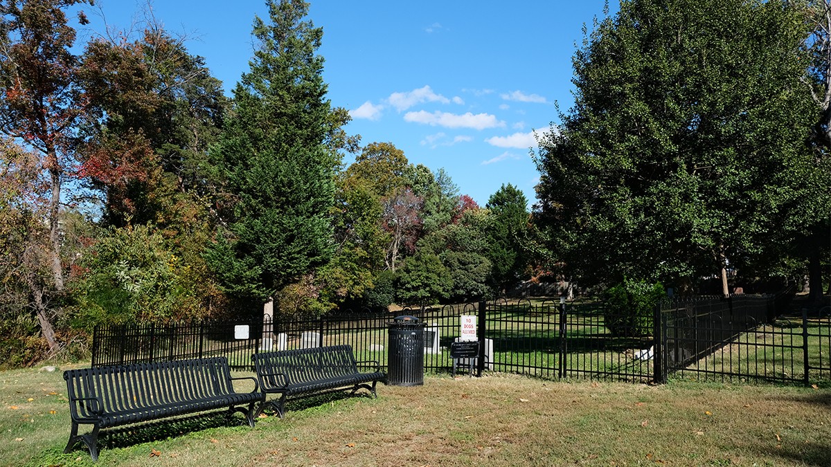 Today, the burial ground is edged to the north and east by a densely canopied, naturalized lot and residential property, respectively. Enclosed on four sides by an ornamental mental fence, a gate along its western edge provides access, where a pair of benches and commemorative signage are also situated. The cemetery includes burial plots and markers—ranging from vernacular, hand-cut to mass-produced, machine-cut examples—laid out in loosely oriented, north-south rows. Characterized by lawn, the site is interspersed with individual trees, including holly and oak, and shrubs. Other trees, including oak and a mature cedar, grow just outside the cemetery, shading the vernacular landscape.