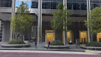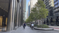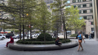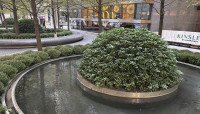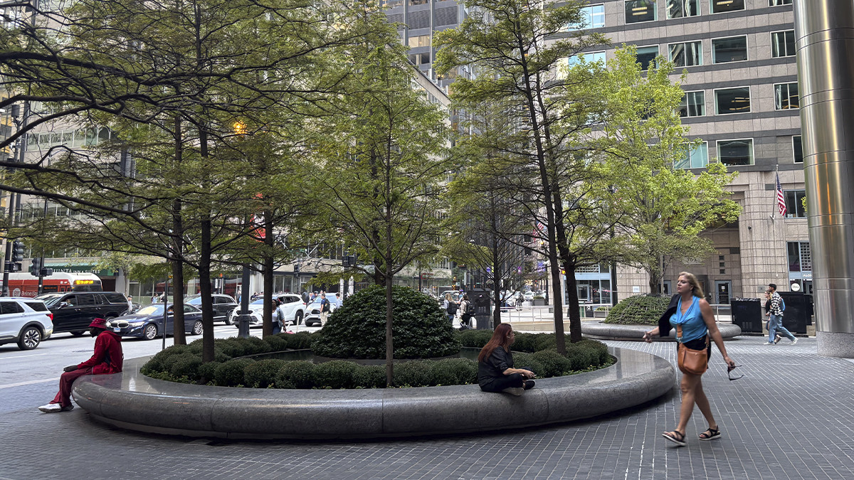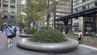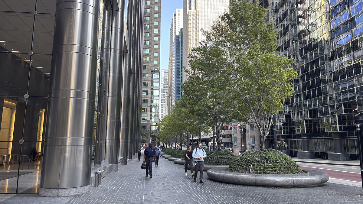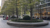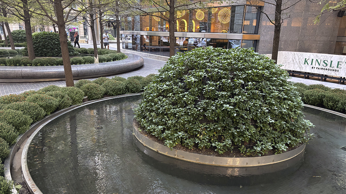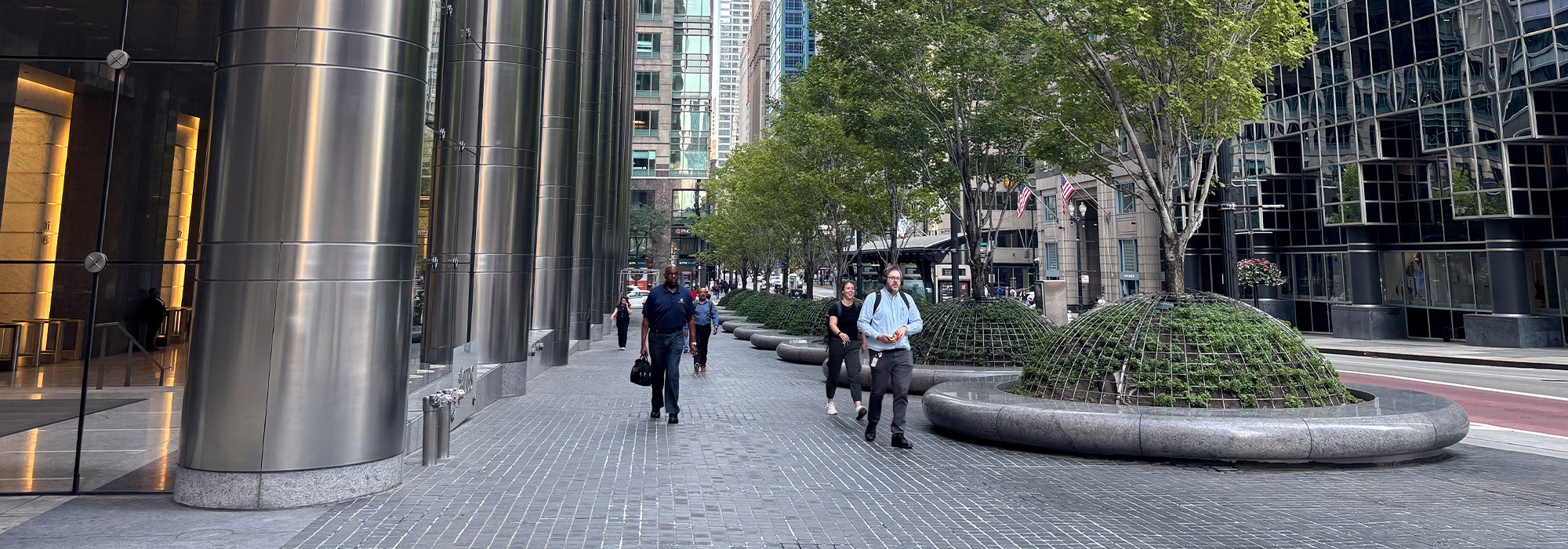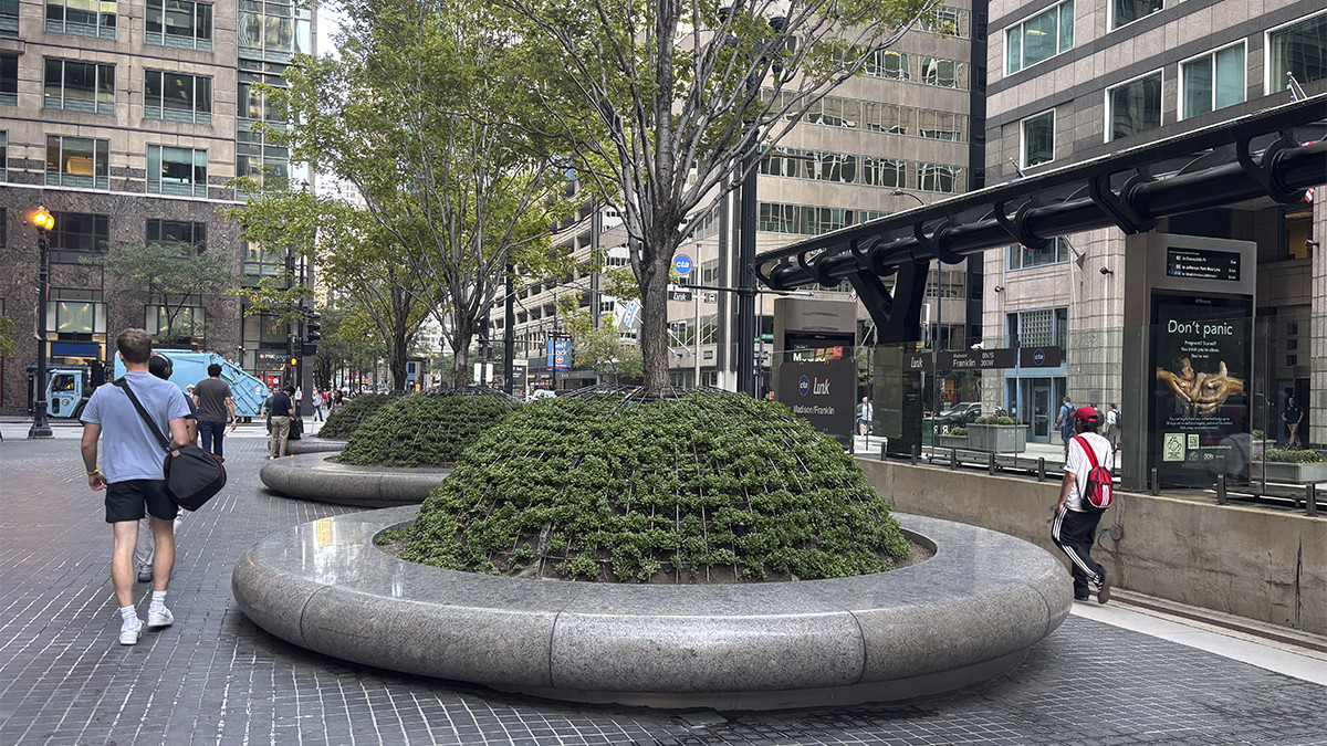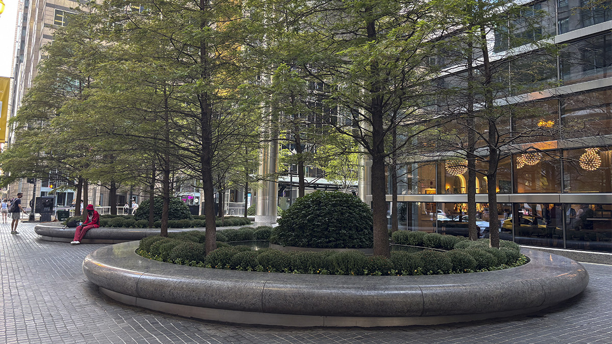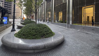 Circular motifs visually tie the plaza to the building, which is supported by metal-faced circular piers. Unable to install conventional tree wells along the building’s southern façade because of subterranean vaults, Walker designed above-grade, hemispherical armatures to protect individual maple trees and ground cover. Underplanted with sedum and encircled by polished stone benches, ten such armatures are spaced 30 feet apart along a gentle, downward slope.
