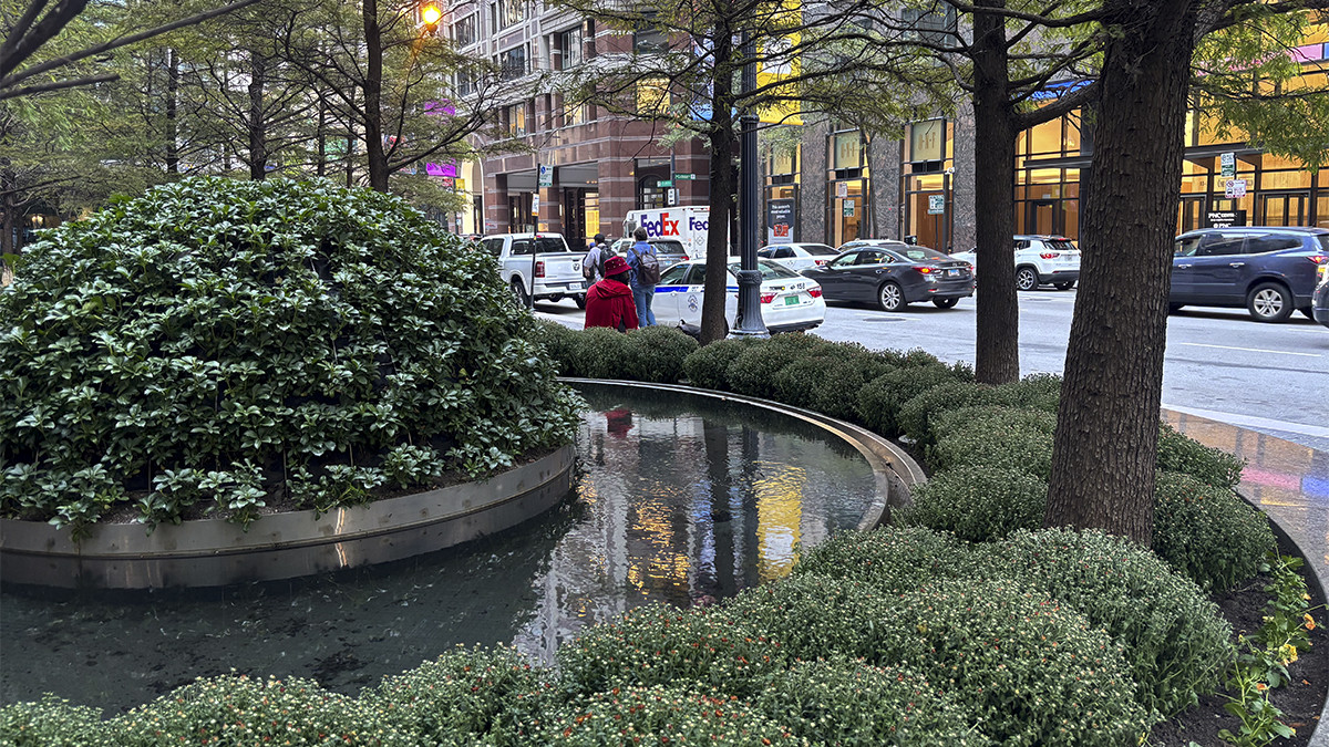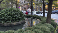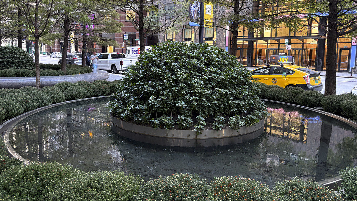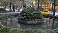 At the plaza’s eastern edge are three circular stone benches, each of which surround a water basin ringed by eight bald cypress trees and embellished with a central, halved hemisphere planted with pachysandra. These hemispheres, when reflected in their respective basins, appear as full spheres. The water basins subtlety flows into a narrow circular channel, encompassed by flowering herbaceous underplantings. Two smaller circular benches, each holding a maple specimen, anchor the plaza’s northeast corner.