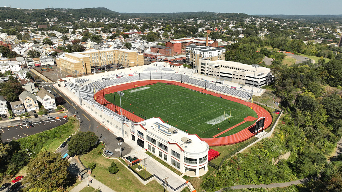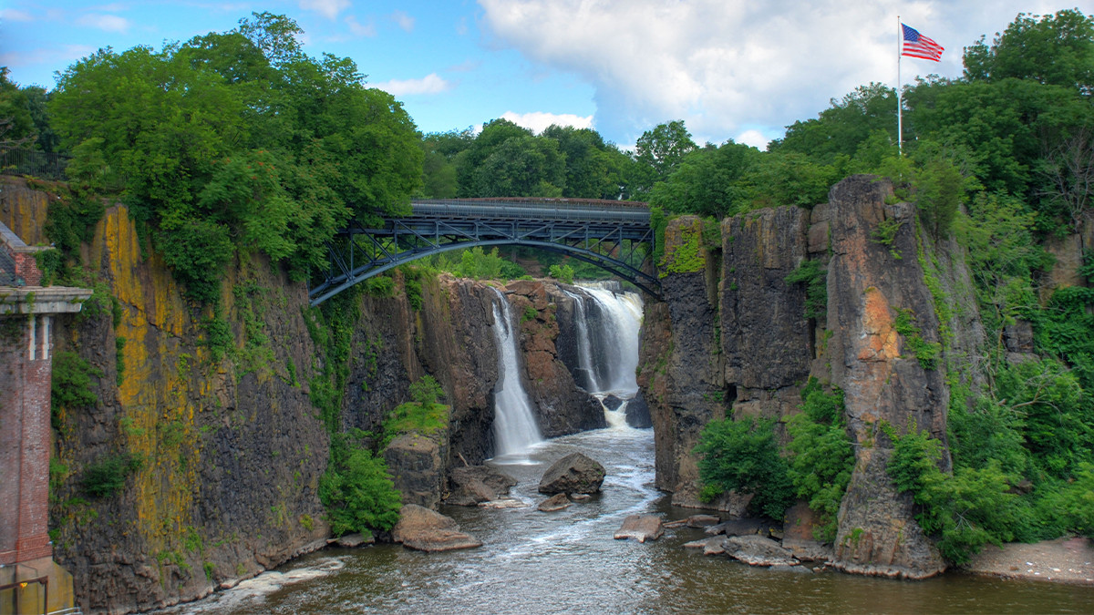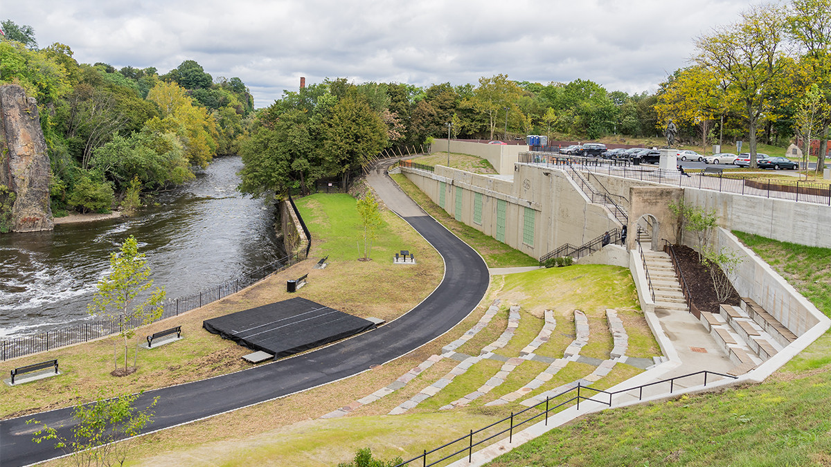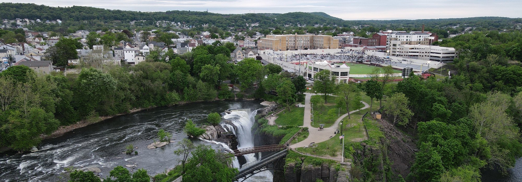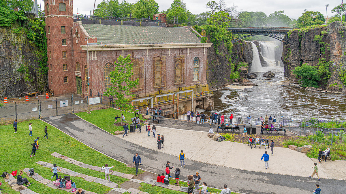 Situated west of downtown on land once occupied by the Lenape, this irregularly shaped 52-acre park, founded by Alexander Hamilton in 1792, spans both sides of the Passaic River and reflects the town’s industrial heritage. The following year the Society for Useful Manufactures (SUM) began concentrating industrial development, including a hydropower system with raceways (1790s), designed by architect and engineer Pierre Charles L’Enfant. Growth continued into the nineteenth century, including the extant SUM Electric Generating Plant (1912) on the east side of the river. To the west, atop an abandoned quarry (later a burial ground, town reservoir, and industrial property), the site was dubbed Monument Heights Playground by the 1930s. Here, the Olmsted Brothers and architect John Shaw designed Hinchcliffe Stadium (1932, rehabilitated 2023), which became home to two Negro League baseball teams: the New York Black Yankees and the New York Cubans.
