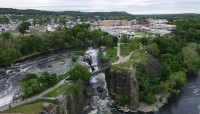 Connected by a footbridge overlooking Great Falls, the park’s west side is level with the top of the falls, while the east side has a lower elevation. Designated viewing areas situated across the varied terrain provide panoramic views of the 77-foot falls, concrete dam (1830–1840), and precipitous, rocky bluffs framing the chasm. One is Mary Ellen Kramer Park, west of the waterfalls, which features a plaza and looped walkways that connect to a pedestrian bridge to the east side, where it continues down to Overlook Park. A small plaza offers a staircase down to rows of roughhewn-stone and concrete seating set into a grassy slope. The waterway sustains deciduous canopy trees, ferns, and expanses of grass along its riverbanks and faces of the bluffs.