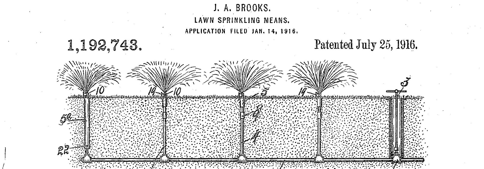 Born in Thornberry, Canada, Abram (later John A.) Brooks studied plumbing as a young man. After achieving the title of master plumber, he established a plumbing company in Toledo, Ohio, under his changed name. In 1915, there he developed and installed an innovative, underground, pop-up sprinkling system at the residence of Lillie I. Donat, which he patented the following year as the “Lawn Sprinkling Means” system. In 1917 he relocated to Detroit, where the auto industry was establishing a strong foothold.