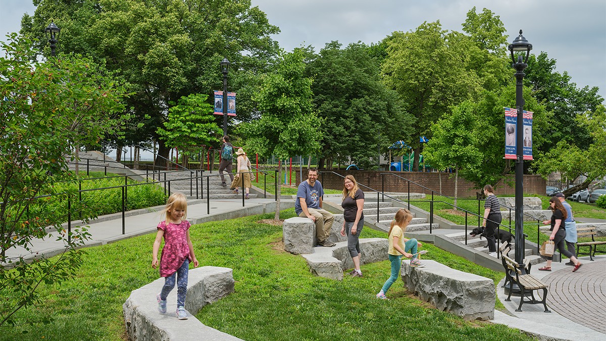 The park, originally linear, was initially used by the city’s militia as a parade ground. It was improved in the early 1830s with paths and perimeter fencing. In the second half of the nineteenth century, parallel paths separated by lawn panels were laid out at the bluff’s edge, delineated by a wrought iron fence. Irregular rows of deciduous shade trees and benches were introduced throughout, and by the early twentieth century, the lawn panels were elevated and edged with stone curbs. The park's enlarged footprint is the result of the addition of a parcel perpendicular to the bluff, which was added in the 1970s.