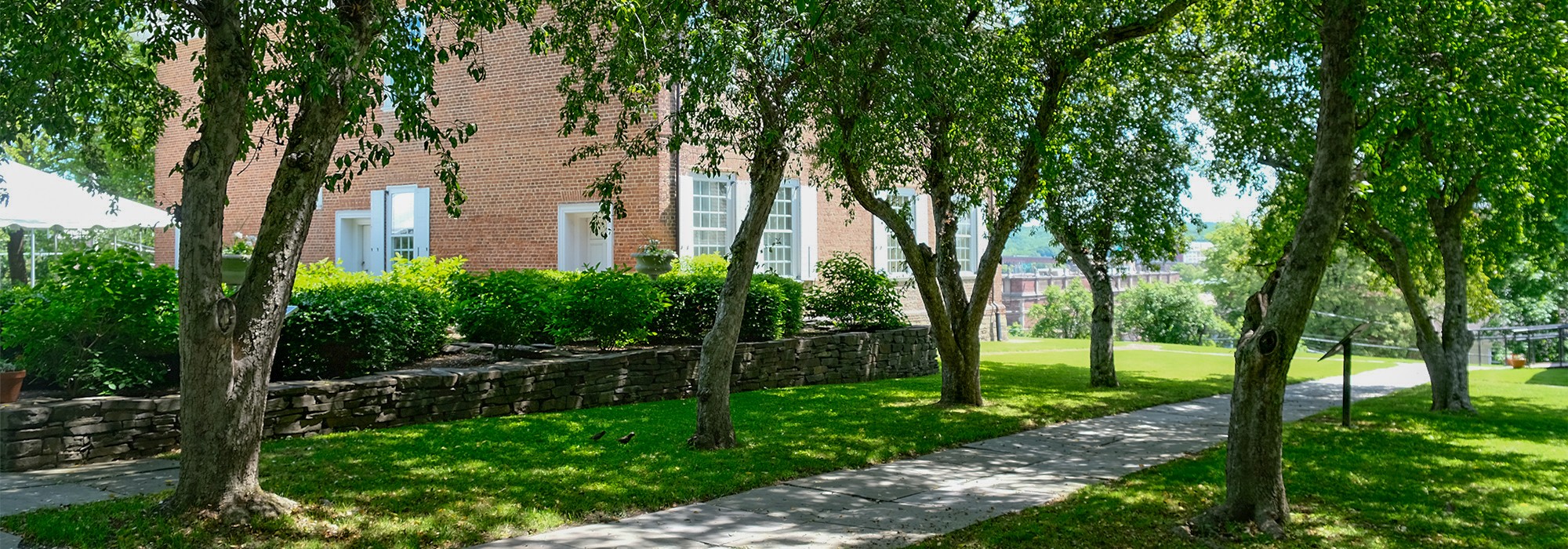From the property’s northeast corner, flights of stairs, each framed by stone walls, lead to a modest, curvilinear brick path and the residence’s eastern façade, shaded by a specimen locust tree. The path connects to a linear stone walkway and a former caretaker’s house, now a visitor center. Southeast of the residence is an east-west oriented path flanked by flowering deciduous ornamental trees and a modest Colonial Revival garden planted with flowering shrubs and clipped boxwood hedges.