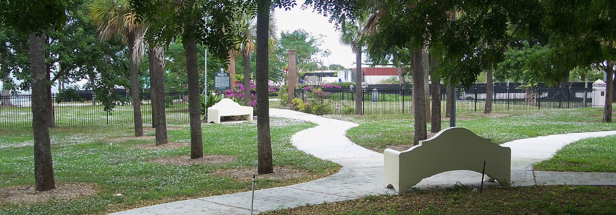 The relatively level, grassy terrain of the rectangular park is populated by deciduous and evergreen canopy and palm trees, flowering shrubs, and, concentrated in the northeast and southwest corners, dense banyan tree growth. Three curving pathways stem from a circular memorial at the bottom of the site, wending through the landscape to the entrance located on Tamarind Avenue to the east, a pergola to the west, and the Pauper’s Cemetery in the northeast, its perimeter lined by an iron fence and two red granite pillars marking the entrance. The pathway continues to the northeast corner of the cemetery, where a 40-foot by 80-foot iron fence—punctuated at each corner by granite piers—marks the location of the one-acre mass-burial ground.