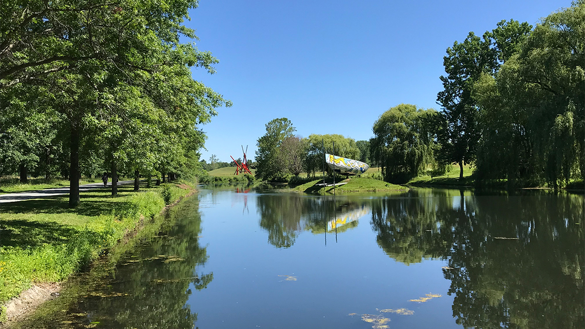 Several artworks respond to the landscape, including sculptures by Andy Goldsworthy and a monumental earthwork by Maya Lin. Goldsworthy’s Storm King Wall (1997–1998) wends between existing trees, appearing to extend through a pond. Lin’s undulating Strom King Wavefield (2009) evokes the surroundings and responds to the site’s industrial past.