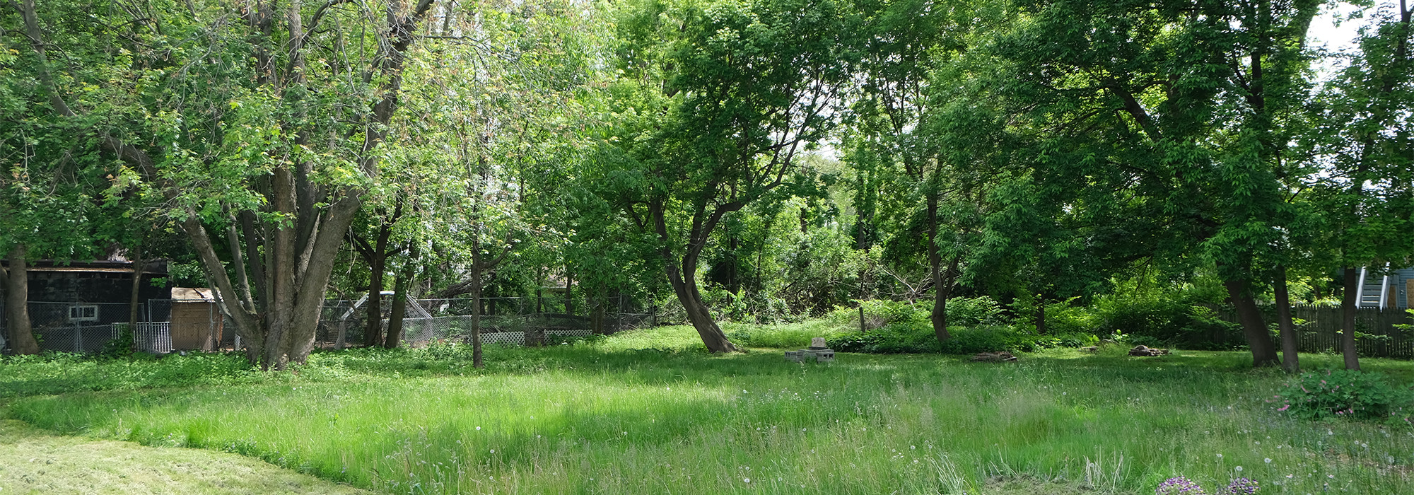 Today the museum is set back from the street by a sidewalk, edged by a lawn verge, and fronted by a modest lawn with shrubs and interpretive signage. Directly west, a brick walkway—edged by a row of ferns—and crushed stone drive leads to the rear of the property, characterized by a brick-paved patio and lawn shaded by a row of deciduous trees, including maple.