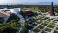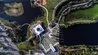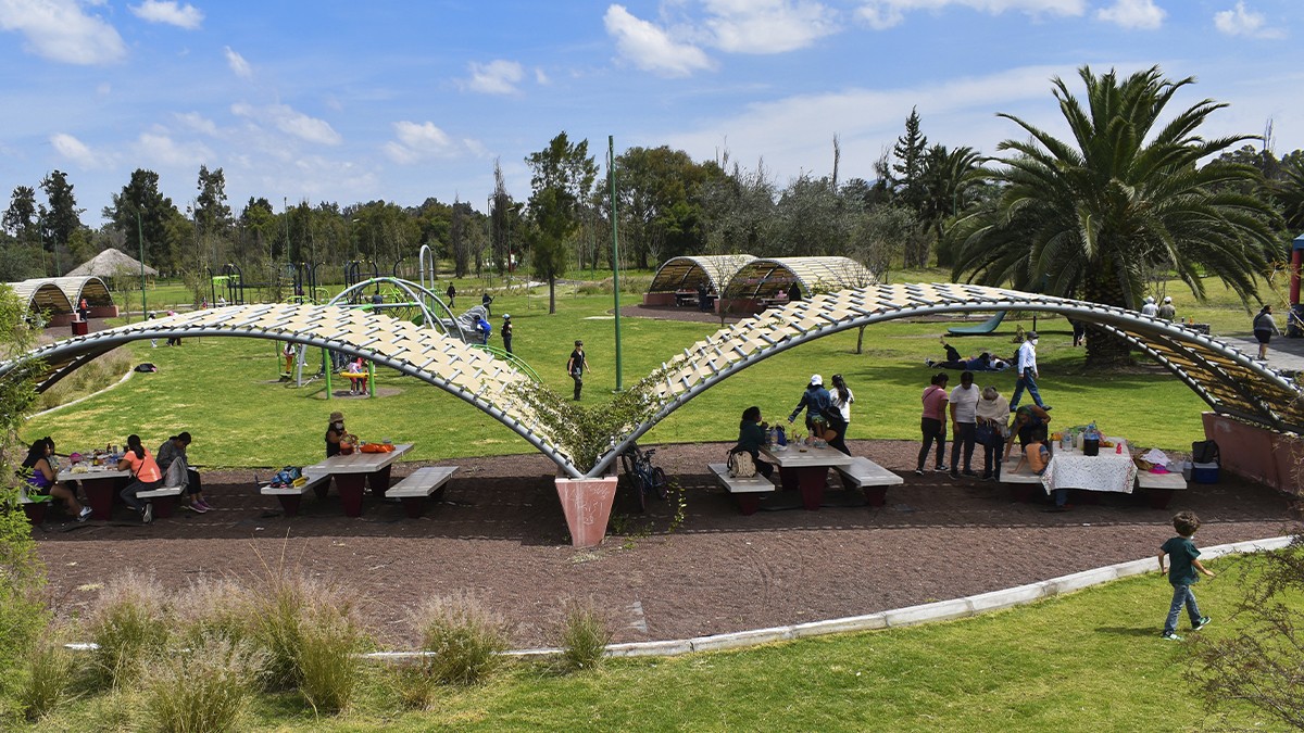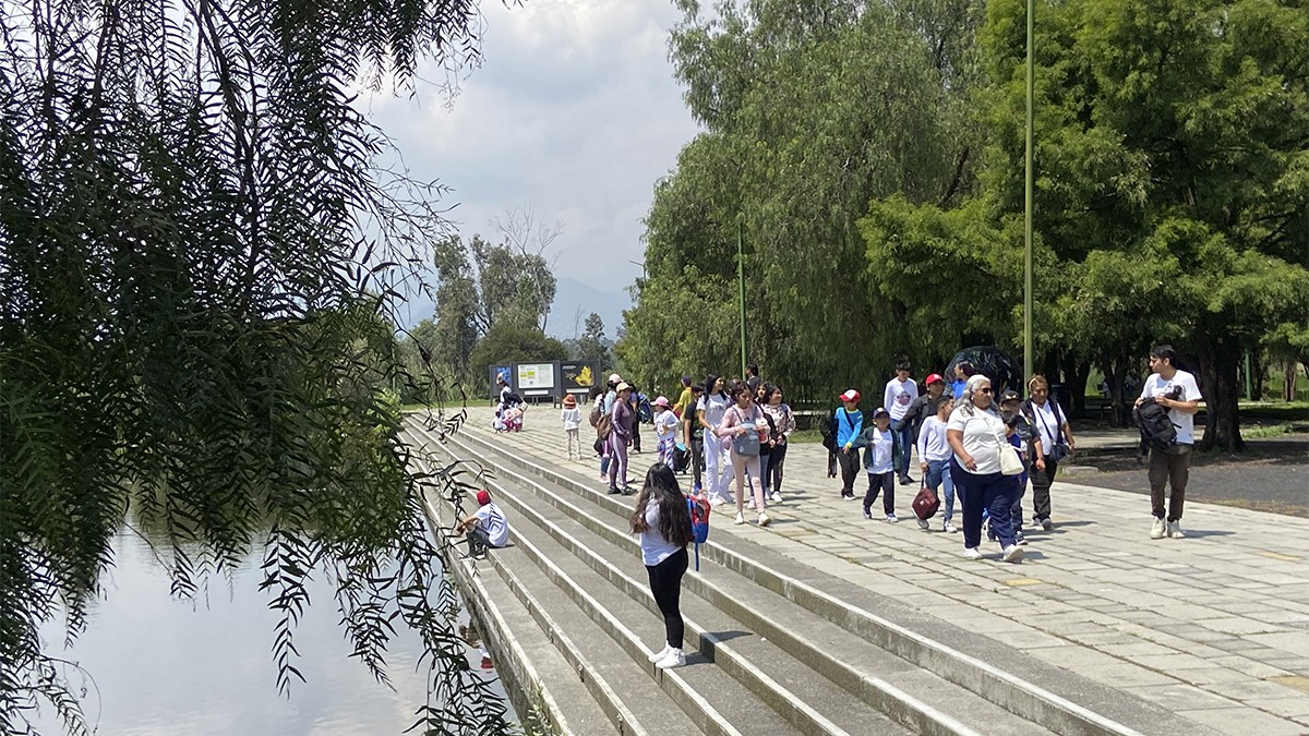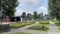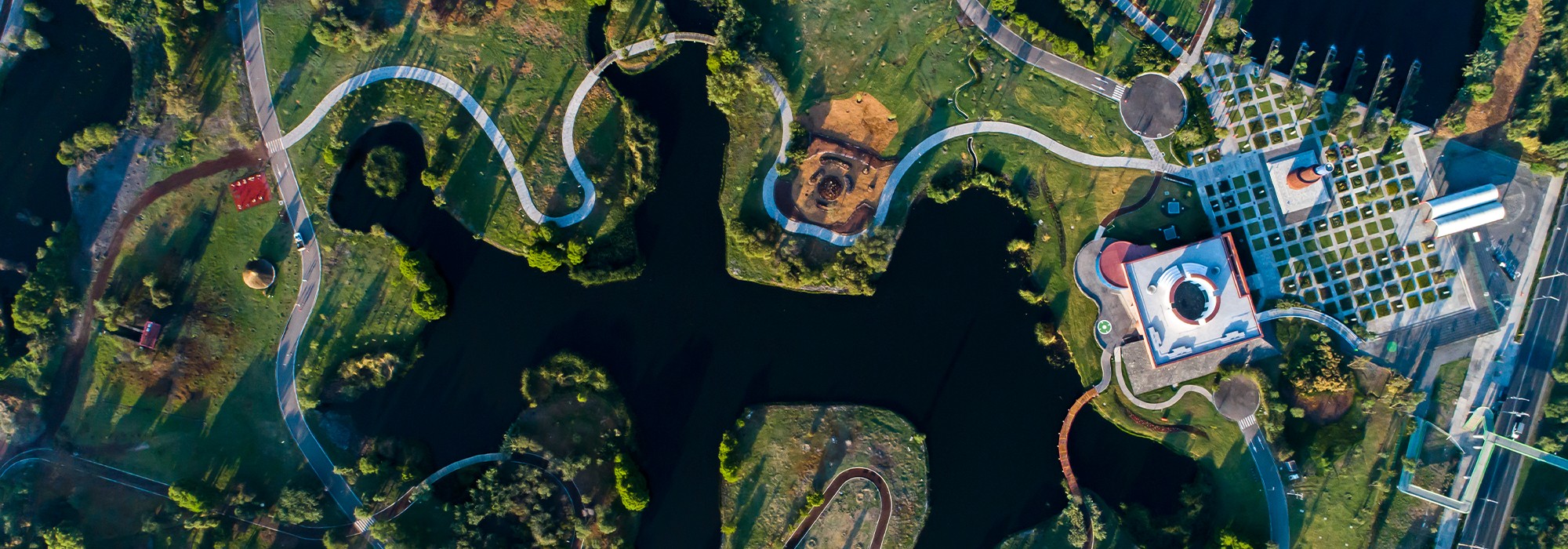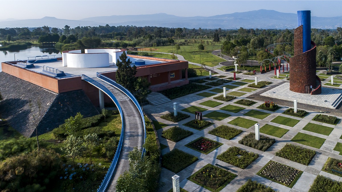 Xochimilco’s southern part abuts the chinampas system, and includes two artificial lakes, wetlands, and canals designed by Schjetnan that collect stormwater and provides habitat for diverse ecological communities, including more than 200 species of native birds and fauna. Main access is provided where the lakes meet: an expansive plaza carpeted in a grid of walkways framing square grass panels. On axis is a visitor center that offers exhibition space, a restaurant, and—accessible from inside or out (via an exterior ramp)—a roof deck providing panoramic views of the park, mountainscape, and distant hills. Off axis is an elevated, helix-shaped water tower.