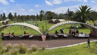 At the plaza’s western edge, seven aqueducts cascade treated water into the western-most lake. A network of curvilinear paths extends from the plaza; one marked by a sequence of arbors that leads to docked trajineras (gondolas)—based on precolonial, flat- bottom boats.